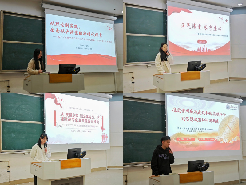 2024级硕士研究生张巧、丘倩、黄珍芝和周宇杰就“从理论到实践:全面从严治党的新时代探索”“正气涤尘 长守廉心”“从‘关键少数’到全体党员:纪律建设的全员覆盖路径探究”“推进党风廉政建设和反腐败斗争的思想武器和行动指南”分别进行主题汇报。