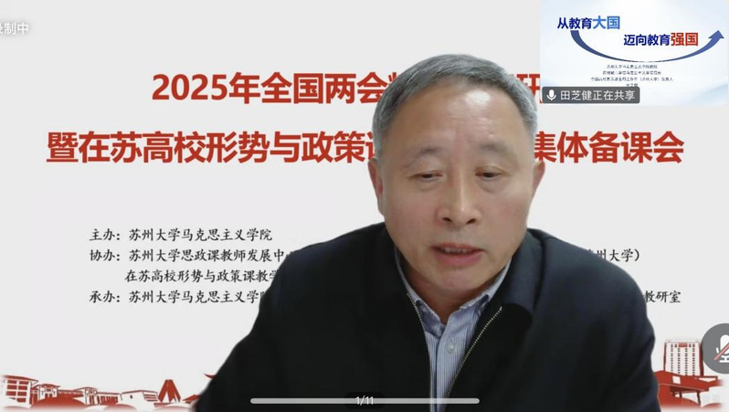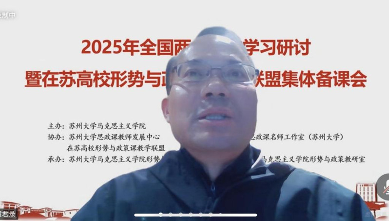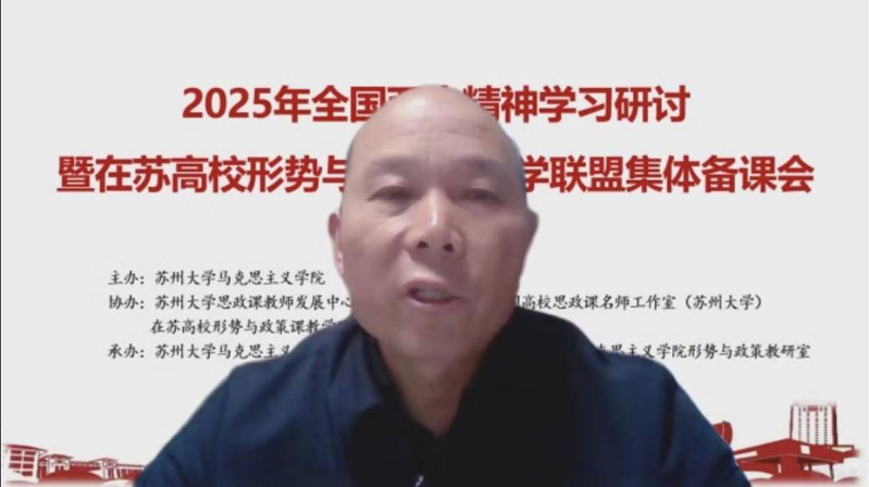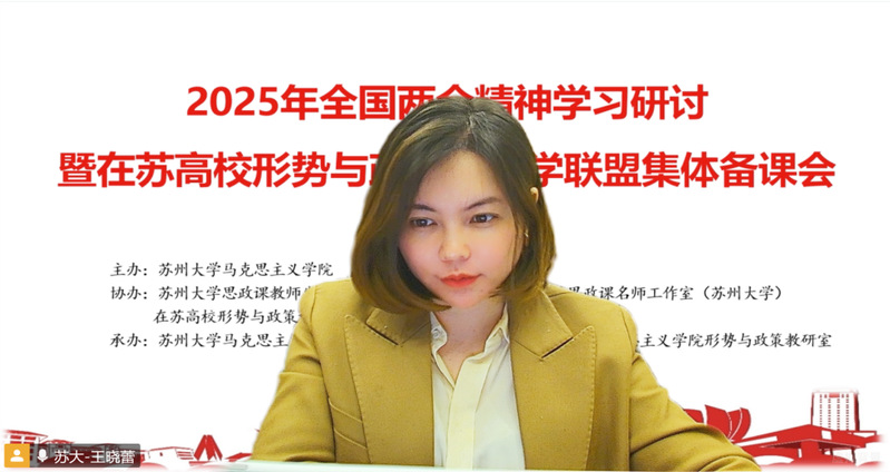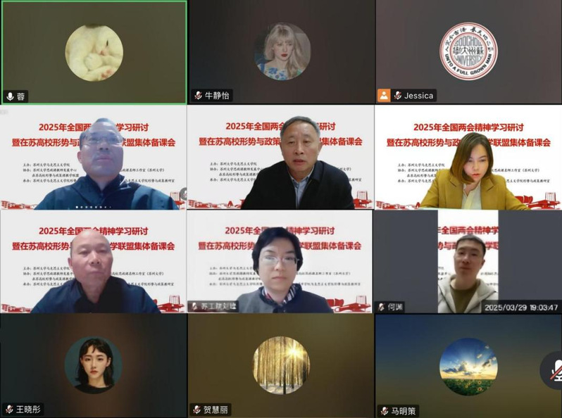 为深入学习贯彻2025年全国两会精神,进一步提升高校“形势与政策”课教学质量,2025年3月29日,由欧美色情片 主办,欧美色情片 思政课教师发展中心、全国高校思政课名师工作室(欧美色情片 )、在苏高校形势与政策课教学联盟协办,欧美色情片 形势与政策教研室、苏州城市欧美色情片 欧美色情片 形势与政策教研室承办的“2025年全国两会精神学习研讨暨在苏高校形势与政策课教学联盟集体备课会”在线成功举行。来自欧美色情片 、苏州城市欧美色情片 、苏州科技大学等在苏二十余所高校的课程负责人、任课教师近80人参加会议。会议由欧美色情片 形势与政策教研室主任王晓蕾主持。