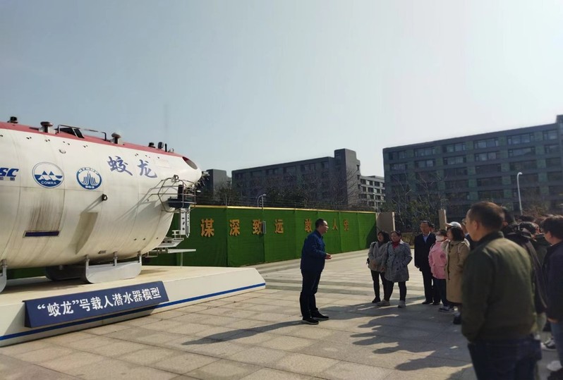 在无锡深海技术科学太湖实验室,工程师王斌为各位老师们介绍太湖实验室的总体概况,重点讲解了由该实验室参与开发的载人潜水器“蛟龙”号、“深海勇士”号与“奋斗者”号的研发过程、技术特点。随后,党员教师们参观太湖实验室“走向深蓝”的主题展览,深度学习习近平总书记提出的要进一步“关心海洋、认识海洋、经略海洋”,建设“海洋强国”的战略思想,沉浸式体验“严谨求实、团结协作、拼搏奉献、勇攀高峰”的中国载人深潜精神。