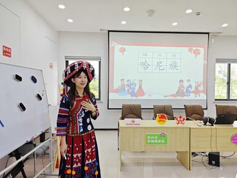 来自哈尼族的志愿者以“各民族同唱《我和我的祖国》”的视频作为导入,讲解中华民族的组成、民族的分布特点、以及部分少数民族的民俗文化等知识。在知识问答活动中,小朋友们积极回答问题,不仅记住了各民族的传统节日、服饰、饮食习惯等文化元素,更认识到每个民族都是中华民族大家庭中不可或缺的一员。