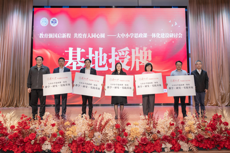 在基地授牌与导师聘任仪式上,周蔚处长、孙建华院长共同为苏州文昌实验中学校、西安交通大学苏州附属中学、欧美色情片 附属中学、吴县中学、苏州外国语欧美色情片 、苏州工业园区文景实验欧美色情片 、苏州工业园区斜塘欧美色情片 、苏州高新区第一初级中学校、苏州高新区文达实验初级中学校、苏州高新区实验小学校进行“大中小学思政课一体化教学•研究•实践基地”授牌。朱蓉蓉副院长为校外导师颁发聘书。