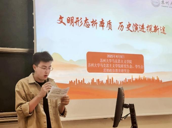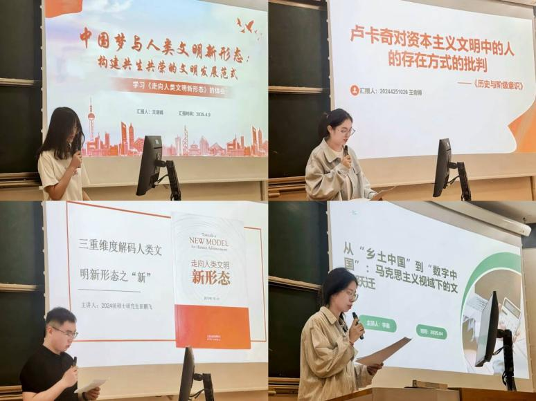 2023级本科生王语嫣和2024级硕士研究生王俞博、田鹏飞、李鑫分别就“中国梦与人类文明新形态:构建共生共荣的文明发展范式”“卢卡奇对资本主义文明中的人的存在方式的批判——《历史与阶级意识》”“三重维度解码人类文明新形态之‘新’”“从‘乡土中国’到‘数字中国’:马克思主义视域下的文明跃迁”进行主题汇报。