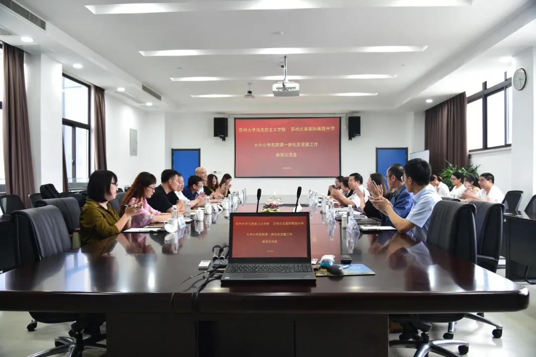 田芝健院长充分肯定了苏州北美国际高级中学在党建工作以及大思政课建设等各方面所取得的成效。他表示,苏州北美国际高级中学的先进办教学理念及办学特色,对高校思政课建设和人才培养很有启发;我们将发挥各自优势,整合优质资源,完善与学生年龄特征相符合、与时代特点相适应的思想政治教育体系。苏大马院将进一步加强与苏州北美国际高级中学之间的交流与合作,进一步有效推进双方思政课大中小学一体化建设,建立院校协同立德树人的一体化育人机制,携手共促思政课建设内涵式发展。