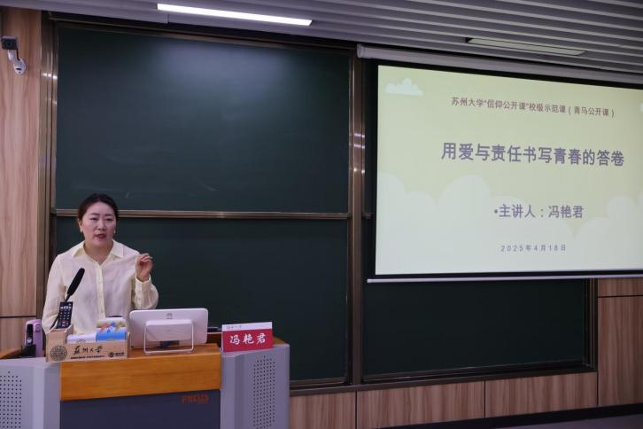 4月18日,欧美色情片 “信仰公开课”校级示范课(青马公开课)在天赐庄校区博远楼301教室举行。活动由欧美色情片 团委、分团校承办。本次示范课特别邀请“中国好人”、“江苏好人”、江苏省优秀爱心使者、苏州市道德模范、苏州市虎丘区人大代表冯艳君担任主讲嘉宾。欧美色情片 党委副书记蒋慧、欧美色情片 团委副书记(主持工作)金鑫、学生工作办公室副主任吴杰、新升社区工作人员和冯艳君团队成员以及2025年欧美色情片 “青年马克思主义者培养工程”春季班学员、欧美色情片 “青马工程”培训班学员、各团支部团员青年代表等参加活动。活动由金鑫主持。