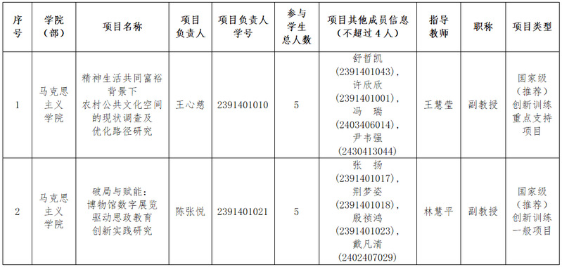 2025年大学生国家级(推荐)创新训练重点 支持项目、国家级(推荐)创新训练一般项目院内选拔结果的公示