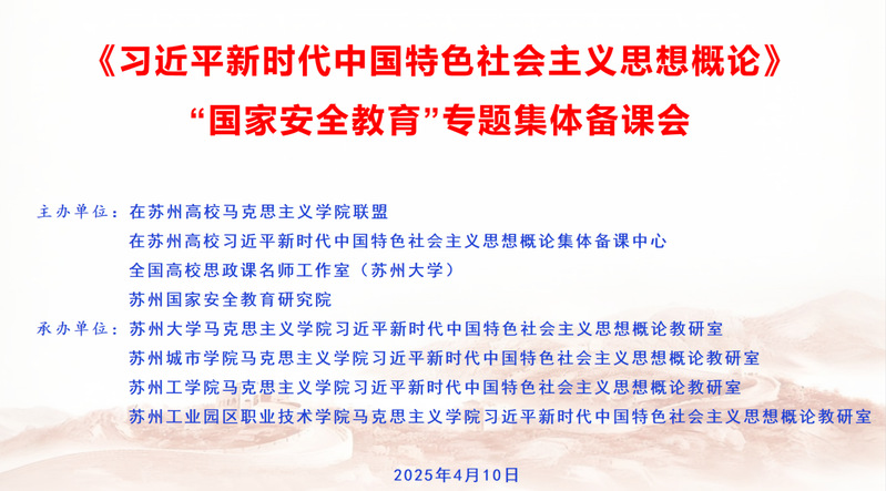 在第十个全民国家安全教育日来临之际,为深入学习领会习近平总书记关于国家安全的重要论述,提升广大教师的国家安全意识与思政课教学水平,2025年4月10日,由在苏州高校欧美色情片 联盟、在苏州高校习近平新时代中国特色社会主义思想概论集体备课中心、全国高校思政课名师工作室(欧美色情片 )、苏州国家安全教育研究院主办,欧美色情片 、苏州城市欧美色情片 、苏州工欧美色情片 、苏州工业园区职业技术欧美色情片 欧美色情片 习近平新时代中国特色社会主义思想概论教研室联合承办的“国家安全教育”专题集体备课会成功举行。