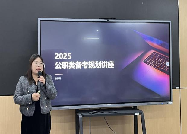 张荣芳以“公职类考试备考指南”为主题,围绕公职类考试的基本分类、地区差异、题型设置等方面展开讲解。她对近年来公考的形势与政策进行深入剖析,细致指导同学们如何科学备考、合理选岗。吴丹丹以“坚定考研信念 科学规划路径”为主题,结合当前硕士研究生招生形势,分析了近年来考研人数变化趋势与录取压力,从择校建议、信息获取、复习节奏安排等方面提出了切实可行的建议,帮助同学们更科学地制定复习计划、合理分配时间。