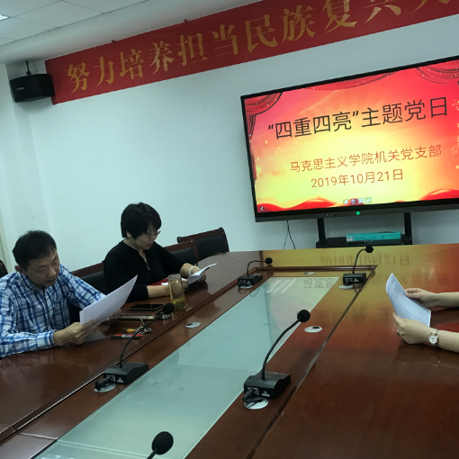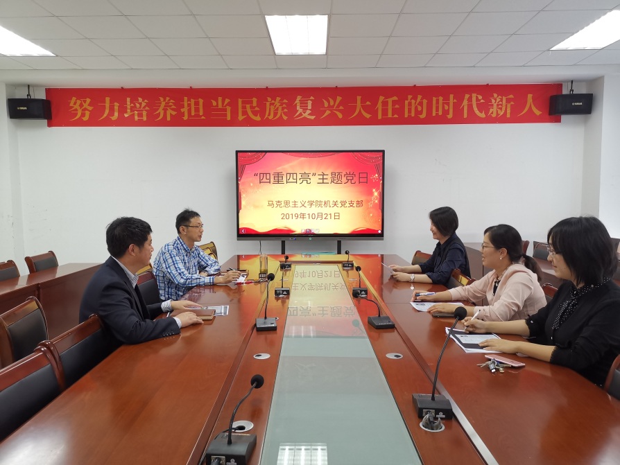 2019年10月21日下午,欧美色情片 机关党支部召开“不忘初心、牢记使命”——“四重四亮”主题党日活动。欧美色情片 党委书记张才君、副院长许冠亭、副院长朱蓉蓉等参加了党日活动。“四重”即重读入党志愿、重温入党誓词、重忆入党经历、重问入党初心;“四亮”即党员亮身份、服务亮承诺;工作亮标准、担当亮作为。