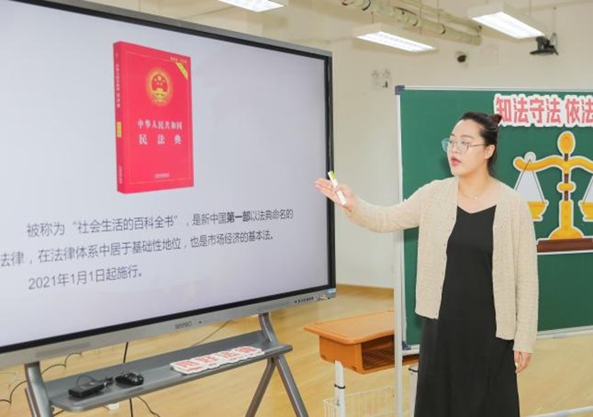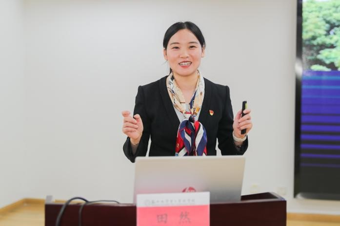 教师高芯伊进行“知法守法 依法维权”小学法治公开课展示。高老师巧妙运用情景教学模式,开展了一堂气氛活泼、内容充实的法治教学课堂。随后,苏大马院思政系师生联合党支部书记田然进行大学法治教育的逻辑课程教学展示。田然老师结合司法案例带领同学们深入法律世界、感受法律魅力、浸润法治氛围、汲取法治力量。