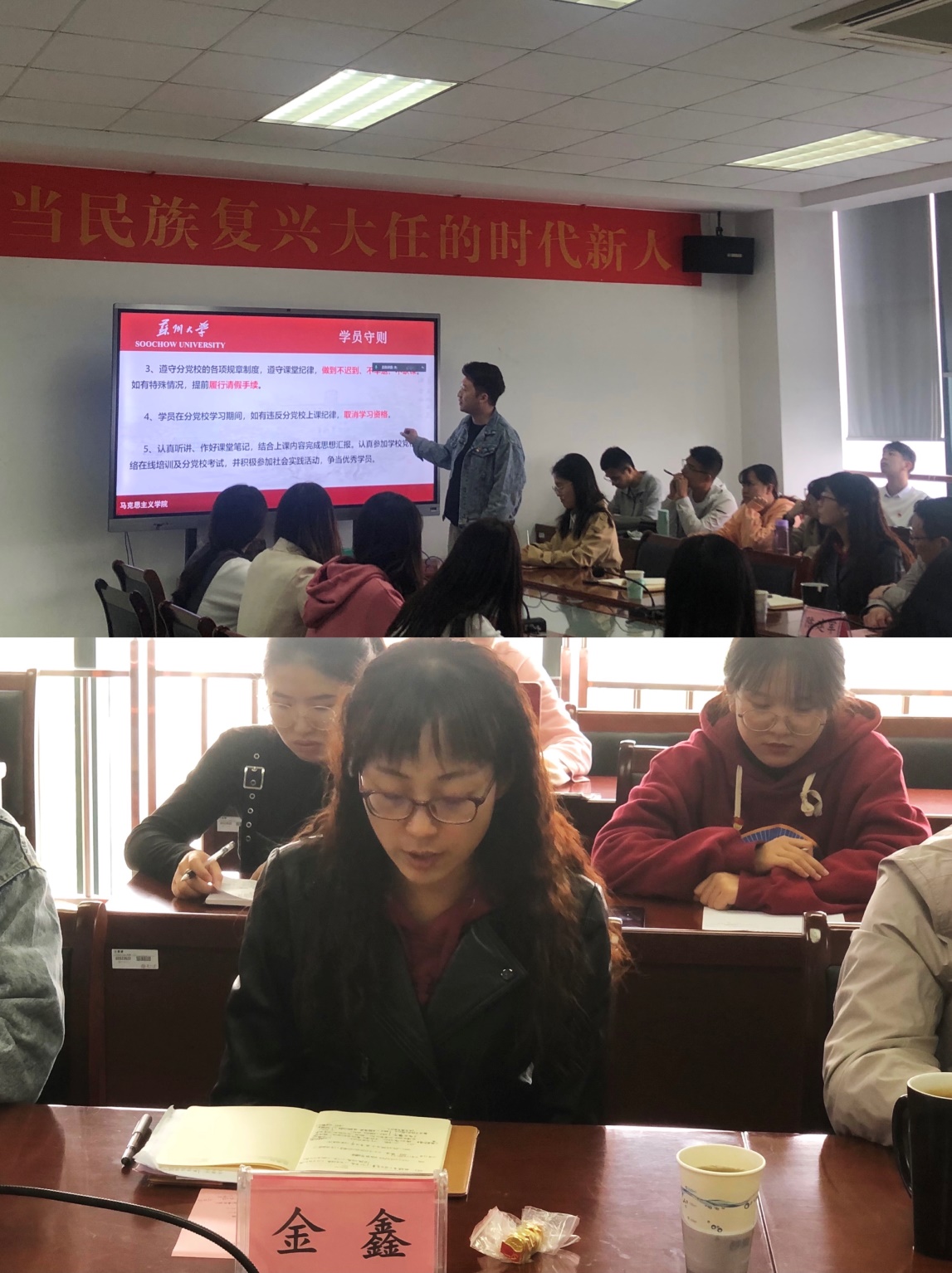 金鑫老师希望大家端正自己的入党动机,时时刻刻以正式党员的标准严格要求自己,努力向优秀的党员靠拢,早日成为一名合格的党员。