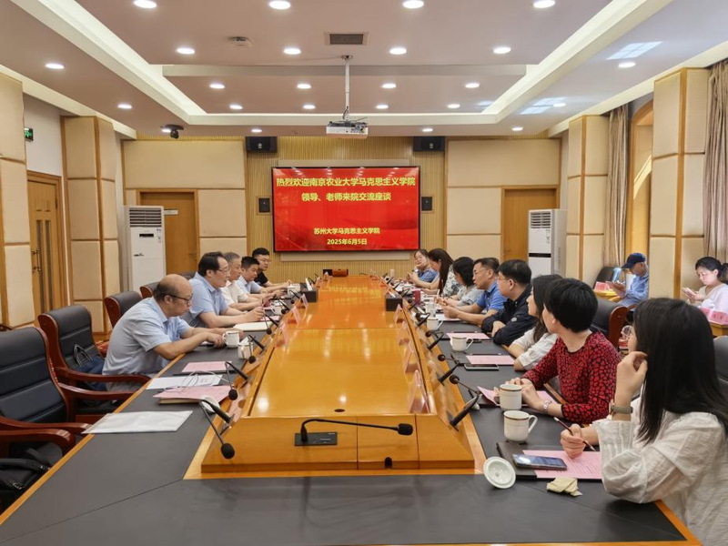 为学习贯彻党的二十届三中全会精神,深化院际交流合作,更好推进思政课教学改革创新,2025年6月5日,由南京农业大学欧美色情片 付坚强院长、朱鹏副院长带队,习近平新时代中国特色社会主义思想概论教研室系主任陈蕊一行来苏大马院调研交流。欧美色情片 院长孙建华教授,欧美色情片 党委委员田芝健教授,教师第三党支部书记杨余春,习近平新时代中国特色社会主义思想概论教研室主任吉启卫和胡小君教授、祁文博老师等参加活动。活动由孙建华主持。