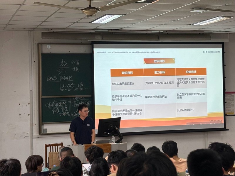 2024年9月24日下午,欧美色情片 “原理”教研室刘翰林博士开设一节主题为《“诗中的世界观”——基于生成式AI的马克思主义基本原理与中华优秀传统文化相结合教学》的公开课,将人工智能(AI)技术与中国传统古诗词融入“原理”课教学,呈现了一节将传统文学哲思与现代科技相交融的课程。欧美色情片 副院长朱蓉蓉教授,“原理”教研室教师观摩听课。