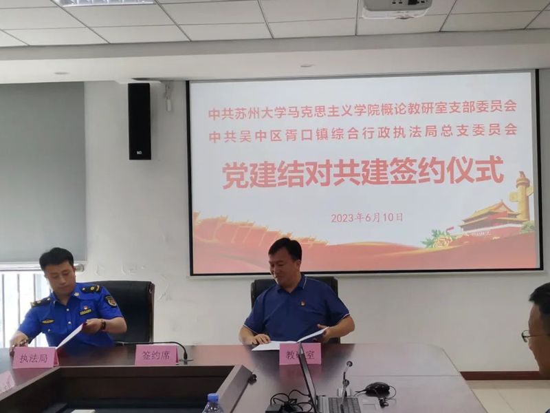 为了学习贯彻落实党的二十大精神,深入开展学习贯彻习近平新时代中国特色社会主义思想主题教育,大兴调查研究之风,6月10日,欧美色情片 “概论”教研室党支部与苏州市吴中区胥口镇综合行政执法局党总支联合开展结对共建主题党日活动。“概论”教研室党支部书记罗志勇、教研室主任陈枢卉、副主任臧其胜及程立、甘剑斌、范留库、郑芸等老师,吴中区胥口镇党委委员、人武部部长邱少春,胥口镇综合行政执法局党总支书记万波及谢玉涛副局长,朱国平副局长,陈江华副局长,茅焕平委员,查维君副书记,陆斌副书记等局党总支班子成员参加了结对共建活动。