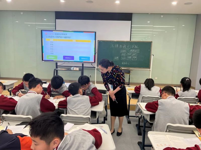 见习课上,徐宏飞老师进行了“法律为我们护航”的公开课展示。活动伊始,徐老师以“导思维——思现象——知法宝——我践行——练一练”的总体框架进行课堂教学,紧密结合课本知识,通过案例分析、小组讨论、课堂训练等教学方式,让学生们理解并掌握未成年人需要特殊保护的原因、保护未成年人成长的防线和措施等知识点。教学过程中,徐老师鼓励同学们积极发言,师生间互动密切,课堂氛围轻松活跃,课堂内容丰富充实。
