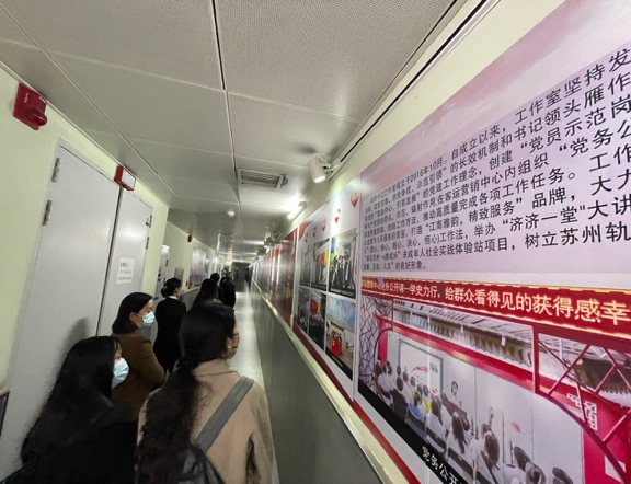 实践团队接续走访调研了广济南路区域党支部和苏州火车站区域党支部。在1号线广济南路站的党群服务中心,实践团队详细了解运营一分公司的党支部先锋阵地在政治引领、宣传展示、党建服务等方面发挥的功能与作用。在启程书记工作室,实践团队就工作室“五心工作法”运用和书记领头雁作用发挥等方面展开互动交流。在 “581”服务驿站,实践团队走进风采展示区、学习活动区和便民服务区,对运营一分公司打造“581我帮您”精致服务的有力举措留下深刻印象。