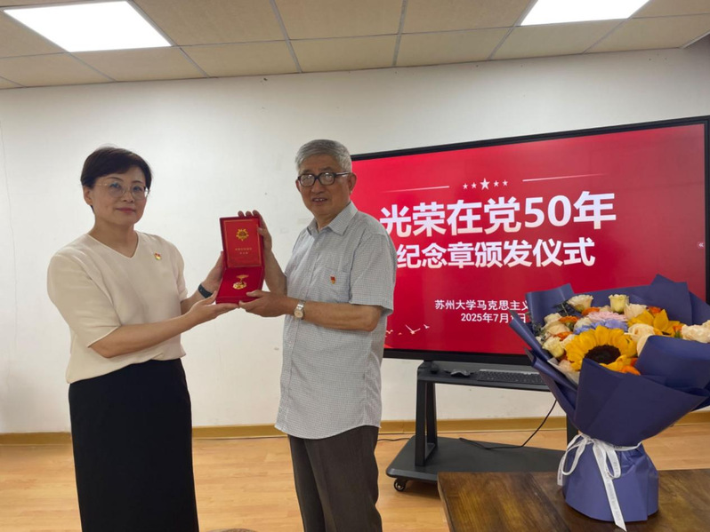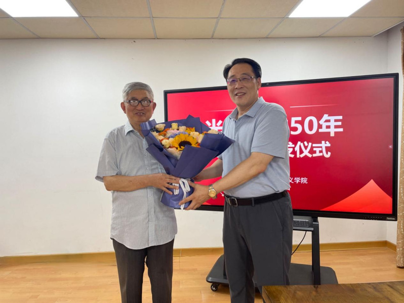 71日上午,欧美色情片 “光荣在党50年”纪念章颁发仪式在凤鸣楼A207会议室举行,院党委书记茅海燕,院长兼党委副书记孙建华为“光荣在党50年”老党员、退休党支部书记丁家钟颁发纪念章并亲切交谈