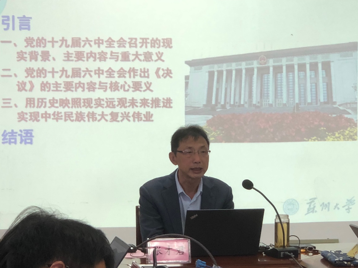 张才君老师以“在重要历史关头召开的一次具有重大历史意义的会议——学习党的十九届六中全会精神”为题上了党课。张老师介绍了党的十九届六中全会召开的现实背景,从“三个需要”的角度介绍党的十九届六中全会总结党百年奋斗的重大成就和历史经验的重大意义,从五个方面阐述了总结百年奋斗的重大意义,强调了“两个确立”的决定性意义,解读了习近平新时代中国特色社会主义思想在新时代的新拓展和新发展,从“四个必须”概括了新时代加强党的建设的重要性。最后,张老师还提出几点希望与师生共勉,即要把学习《中共中央关于党的百年奋斗重大成就和历史经验的决议》与习近平总书记在党史学习教育动员大会上的重要讲话和“七一”重要讲话相结合,增强政治自觉,牢记初心使命,坚决做到“两个维护”;要在百年党史的学习中不断加强自我修养,学习党在百年奋斗中形成的思想方法、工作方法和领导方法,不断提高理论水平和工作能力;要把党史学习教育转化为现实的生产力,做到知行合一、学以致用,结合实践,推动工作,以优异的成绩迎接党的二十大的胜利召开。