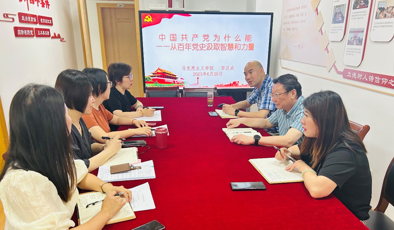 根据学习贯彻习近平新时代中国特色社会主义思想主题教育相关工作部署,2023年6月28日上午,欧美色情片 副院长茆汉成在凤鸣楼304会议室,以《中国共产党为什么能——从百年党史汲取智慧和力量》为题讲授党课。欧美色情片 党委书记陈建军,党委副书记、副院长蒋慧,行政党支部书记李文娟,综合办公室主任刘慧婷,教师发展中心主任刘媛媛,教务秘书徐云露等参加党课学习。党课由行政党支部书记李文娟主持。