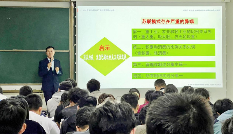 唐老师以“社会主义建设道路初步探索的理论成果”为内容进行专题式教学,坚持问题导向,综合运用多种教学方法,理论联系实际,深入浅出地讲授了社会主义建设时期党初步探索的理论成果的时代背景、丰富内涵及其历史意义,并将党的二十届三中全会精神有机融入课堂教学全过程。在老师的生动讲授和启发下,学生们提高了对社会主义建设时期党的重大理论创新的思想认识,增强了“四个自信”。