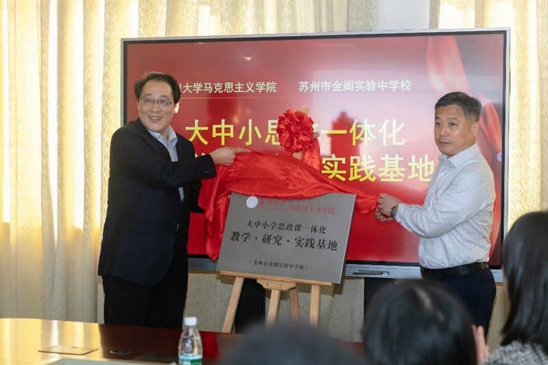 苏州市金阊实验中欧美色情片 党总支书记陈荔主持了签约仪式,思政系主任王淼与金阊实验中欧美色情片 校长杨喆毅签订了大中小学思政课一体化教学研究实践基地共建协议,孙建华院长与杨喆毅校长共同为“大中小学思政课一体化教学·研究·实践基地”揭牌。未来双方将依托各自的资源和平台优势推进实践教学体系、师资队伍建设、科学研究等方面的创新合作,持续推动大中小学思政课一体化实践工作。孙建华表示,希望通过双方的合作共建,把大中小学思政课一体化的工作做细做实,共同推动思想政治教育专业的人才培养、学科建设和科研工作。