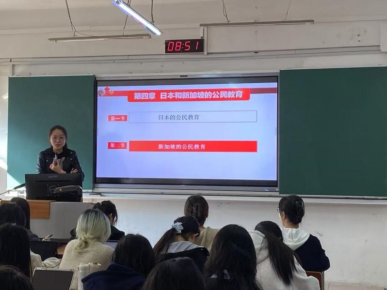 本次课程讲授内容为《比较思想政治教育》第四章的第二节《新加坡的公民教育》,于老师从新加坡的历史、文化讲起,分析了新加坡的地理位置、国土、城市及其历史文化,具体分析了新加坡中小学公民道德教育的目标、内容和途径,并从中新关系、中新教育差异等角度分析了新加坡公民教育的历史和现状。于老师理论联系实际、生动地为师生们展示了一堂比较思想政治教育的课程,授课过程中同学们积极参与互动交流,课堂气氛活跃。