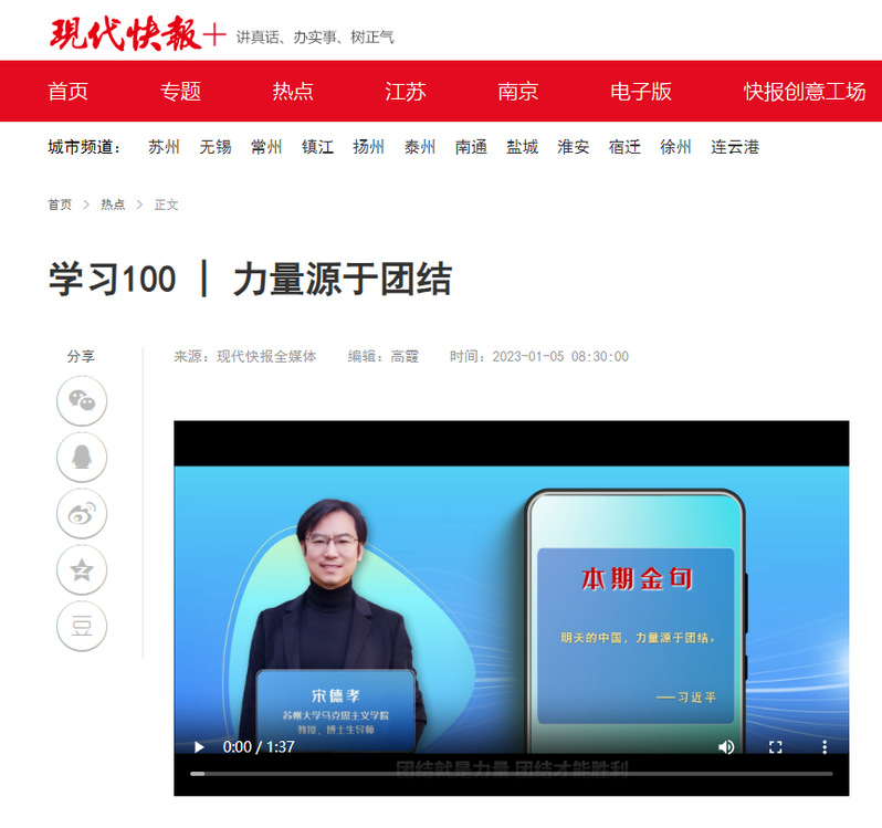 宋德孝线上课程《力量源于团结》在《现代快报》发布