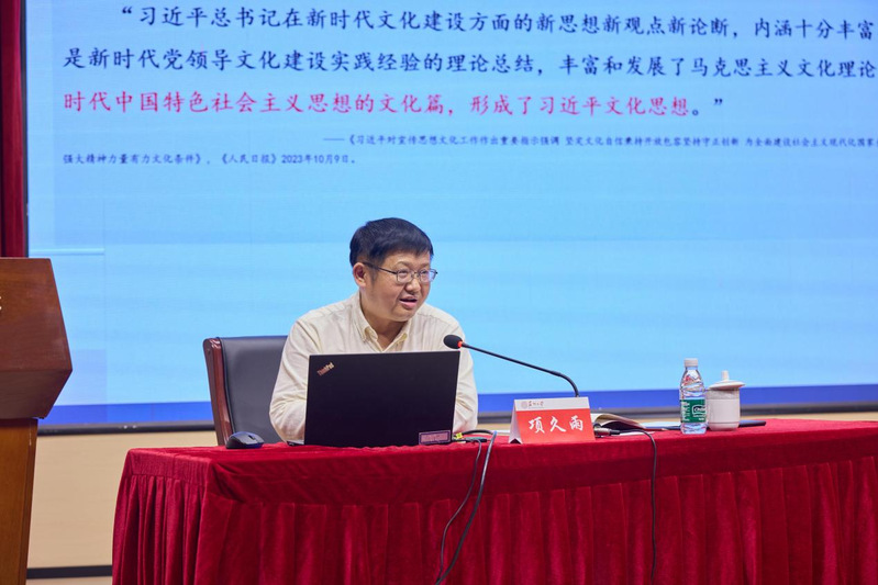 武汉大学主流意识形态研究院院长项久雨作《习近平文化思想的道理学理哲理》专题报告。他指出,要以系统思维体悟习近平文化思想“明体达用、体用贯通”的深刻道理,以历史思维探究“赓续魂脉、厚植根脉”的深厚学理,以辩证思维把握“实事求是、守正创新”的深邃哲理。