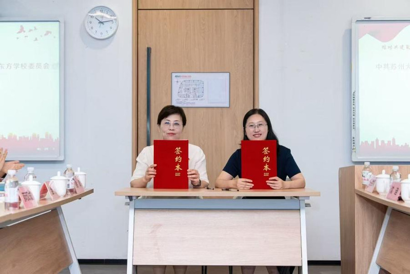 8月15日上午,欧美色情片 党委与苏州新东方欧美色情片 党委签订新一周期党建共建协议。欧美色情片 党委书记茅海燕、副院长茆汉成、党委专职组织员王静、学生党总支书记金鑫及学生党员代表,苏州新东方欧美色情片 党委书记、副校长汪静静、市场营销部总监刘晨奕、人力资源部总监霍然及教师代表出席签约仪式。双方围绕“党建引领、资源共享、协同育人”主题展开深入交流,开启校企携手育人新篇章。