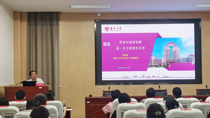 扬州大学周建超教授以《坚持以制度创新进一步全面深化改革》为题作专题讲座。结合教材内容,从理论、历史和现实多个维度,深入剖析了制度创新与全面深化改革的重要意义、发展历程及未来路径。他表示,制度在党和国家事业中具有根本性、全局性、稳定性和长期性地位。习近平总书记强调,制度优势是一个政党、一个国家的最大优势,制度竞争是当前国际竞争的核心。党的二十届三中全会以制度建设为主线,明确深化改革总目标为“继续完善和发展中国特色社会主义制度,推进国家治理体系和治理能力现代化”,体现了党对改革的一以贯之的坚定决心。