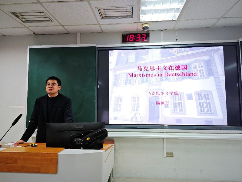 汤葆青以“马克思主义在德国”为主题,结合在德国访学期间所见所闻,以马克思的德国特里尔故居为切入,带领同学们感受马克思的思想魅力,阐述马克思及其思想对世界社会主义的发展与人类历史进程的深刻改变。讲座中,汤老师围绕马克思主义的形成及其在德国的早期发展、德意志帝国时期的马克思主义发展、魏玛共和国时期的马克思主义发展、1945-1990年期间的马克思主义发展、两德统一后的马克思主义发展这五个方面,生动讲述了马克思主义在德国波澜壮阔的发展历程。