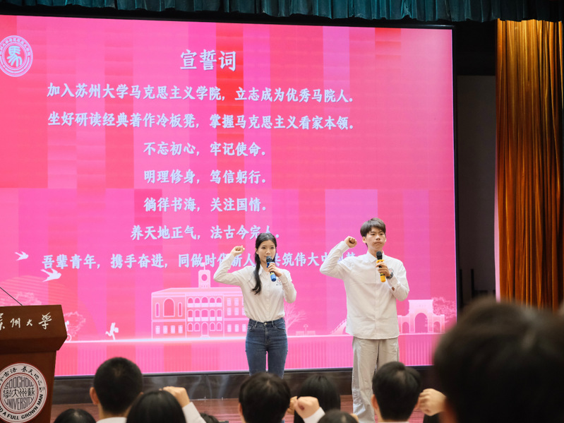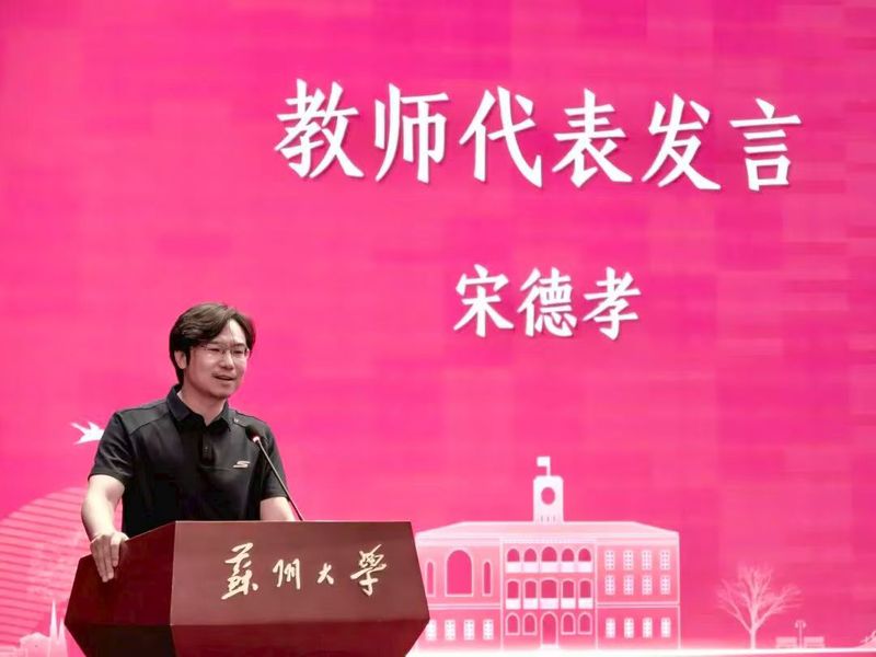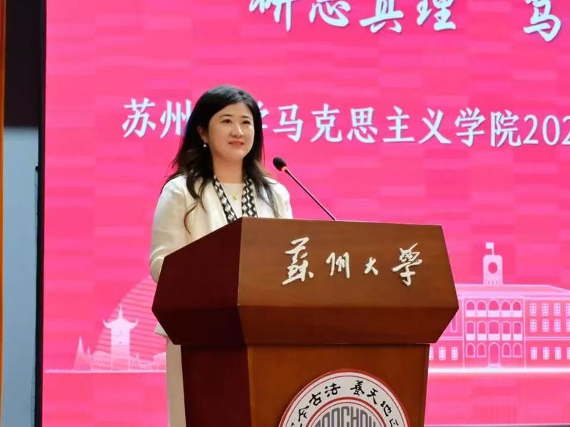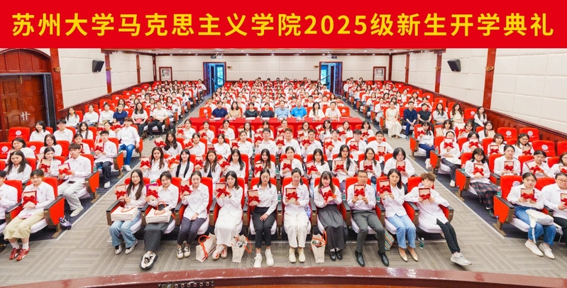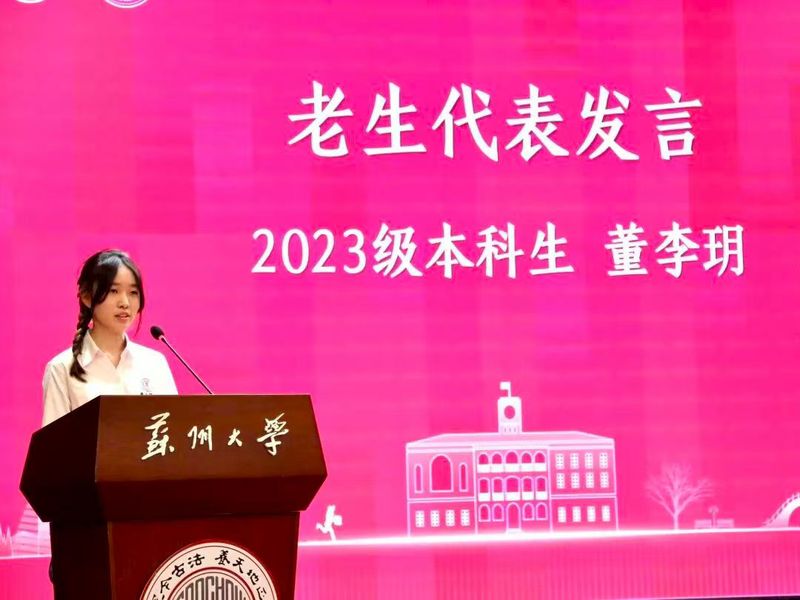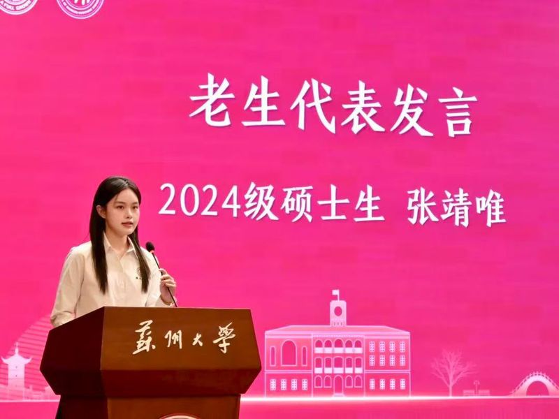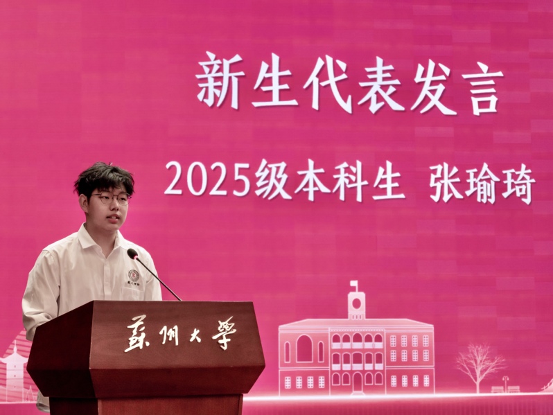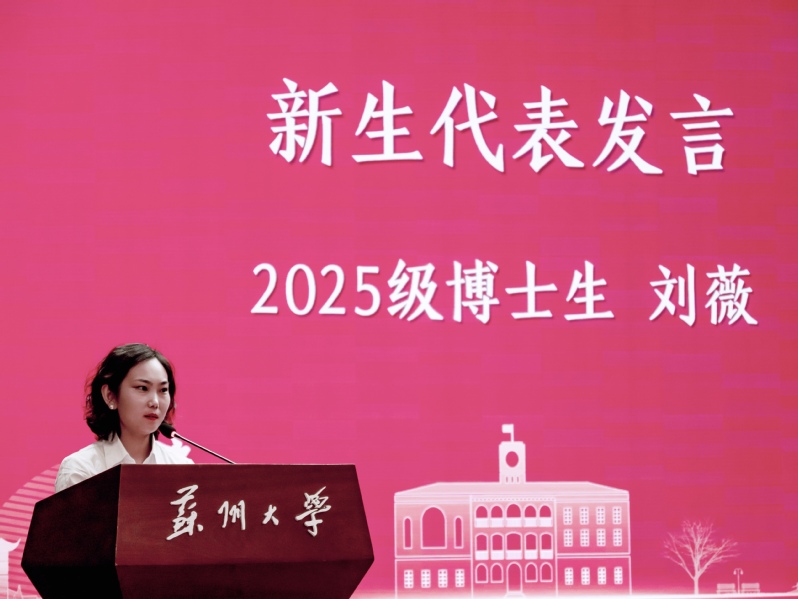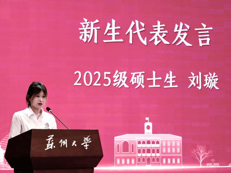 2025级本科生张瑜琦、硕士生刘璇、博士生刘薇作为新生代表进行发言。张瑜琦鼓励大家传承红色血脉,将个人理想融入时代洪流,以专业所学回应时代之问,成长为爱党爱国爱民族的时代新人。刘璇认为新时代研究生当在学术道路上踏实前行、勇攀高峰,以严谨态度与创新思维,在学术浪潮中谱写奋斗答卷。刘薇表达对苏大的热爱,立志以博士生学术担当扎根科研一线,传承“养天地正气,法古今完人”校训精神,为母校荣光贡献智慧力量。