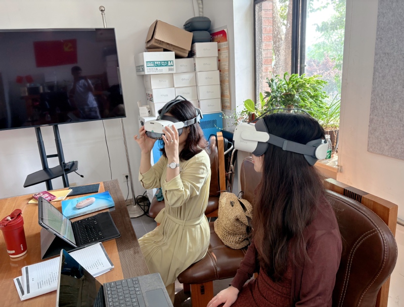 调研过程中,林慧平老师与肖芬芳老师佩戴VR设备,体验了以典型事迹为蓝本开发的虚拟仿真教学项目,“身临其境”感受重大历史场景和人物生平,对该形式的感染力和教学效果给予高度评价。