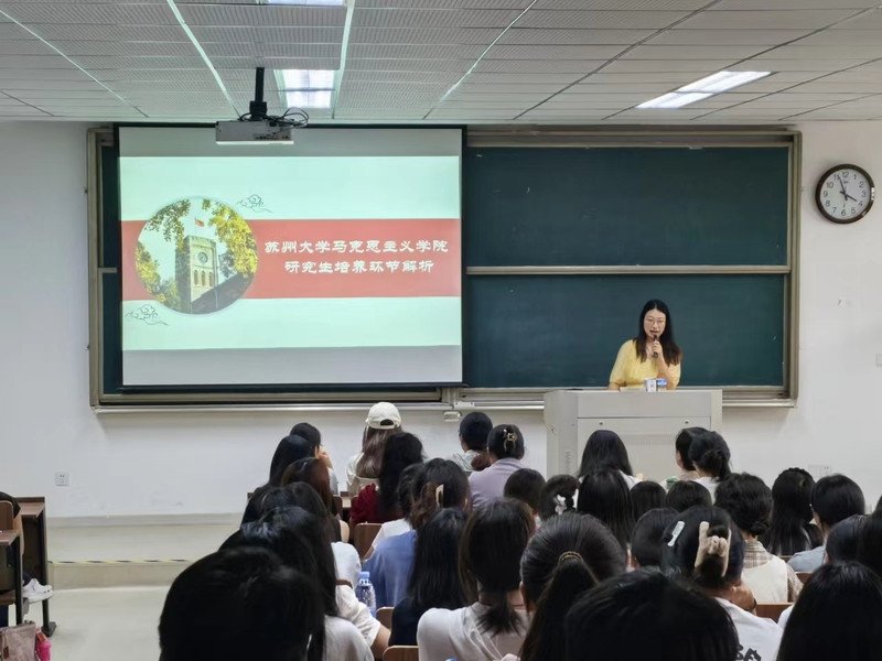 会上,吴莹婕系统介绍了2025级研究生培养方案指导思想,围绕课程设置、学分要求、实践教学、学位论文流程以及毕业条件等关键环节作了详细说明。她要求大家在研究生阶段的学习过程中,必须始终坚持理论联系实践的基本原则,更好发挥马克思主义理论服务实践的作用,同时,鼓励同学们积极参加国内外学术活动、课题研究,培养独立思考和研究能力;以及主动参与教学实践环节,提升教学技能和团队协作能力,为未来的学术发展或职业成就打下坚实根基。李文娟针对同学们普遍关注的课程修读、学位申请流程等问题,逐一作出细致解答,并给予针对性指导。