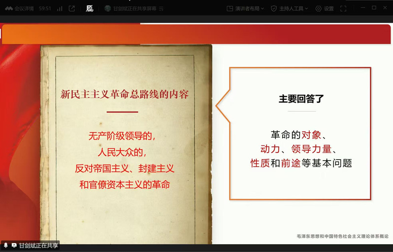 本次集体备课会由甘剑斌老师主讲,讲授内容为“概论”课程第二章第二节“新民主主义革命的总路线和基本纲领”。甘老师首先对教材第二章的内在逻辑进行了解析,然后从新民主主义革命的对象、动力、领导阶级、性质和前途等方面详细讲授了新民主主义革命的总路线,并对新民主主义的政治纲领、经济纲领和文化纲领作了深入细致的讲解。