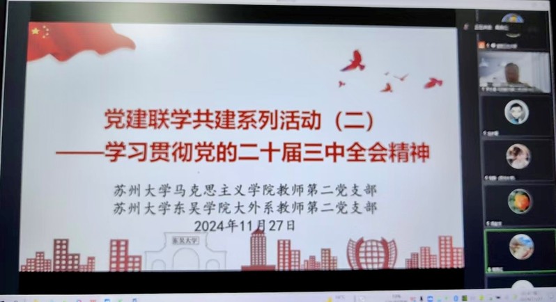 2024年11月27日晚,欧美色情片 教师第二党支部与东吴欧美色情片 大外系教师第二党支部以腾讯视频会议形式举行学习贯彻党的二十届三中全会精神共建联学活动。欧美色情片 教师第二党支部、东吴欧美色情片 大外系教师第一和第二党支部党员参加了共建联学活动。活动由欧美色情片 教师第二党支部书记罗志勇主持。