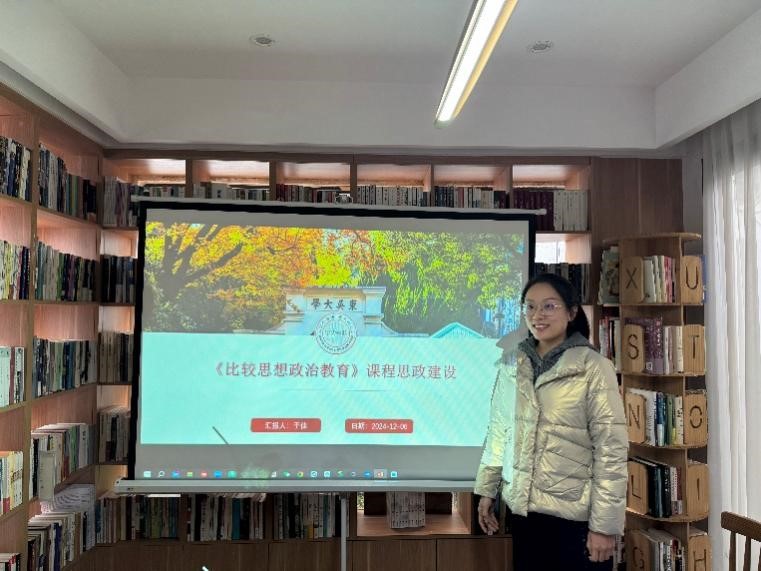 于佳老师以《<比较思想政治教育>课程思政建设》为题,分析了案例教学法、问题探究法、情景模拟法、主题实践法等教学方法中思政元素的关键点和融入方式;从全员参与、多维标准、持续改进等方面分析了课程思政的推进和优化方向。