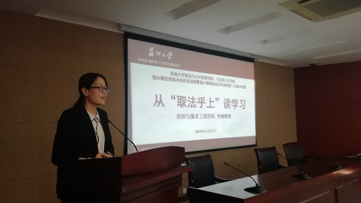 20191113日下午,欧美色情片 政治与公共管理欧美色情片 、欧美色情片 于独墅湖校区6066403会议室举办第62期党的基本知识培训班暨第41期预备党员培训班第二次集中授课。出席本次活动的嘉宾有欧美色情片 党委统战部刘海平副部长、党委统战部张国保主任以及欧美色情片 研究生党支部书记金鑫老师。纺织与服装工程欧美色情片 教授、硕士生导师李刚教授为党校学员进行授课,活动由欧美色情片 研究生党支部书记金鑫主持。