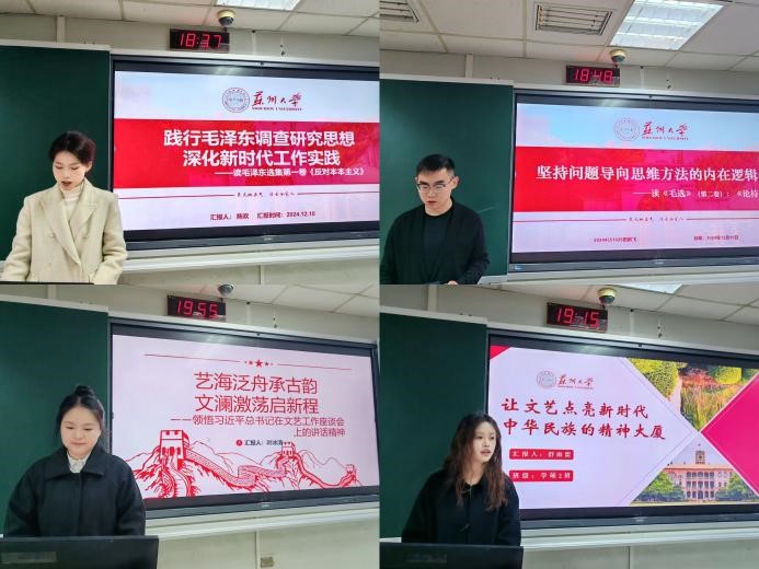 2024级硕士研究生陈欢、田鹏飞、叶冰清、舒雨盟分别以“践行毛泽东调查研究思想,深化新时代工作实践”“坚持问题导向思维方法的内在逻辑”“艺海泛舟承古韵,文澜激荡启新程”和“让文艺点亮新时代中华民族的精神大厦”为题进行主题报告。