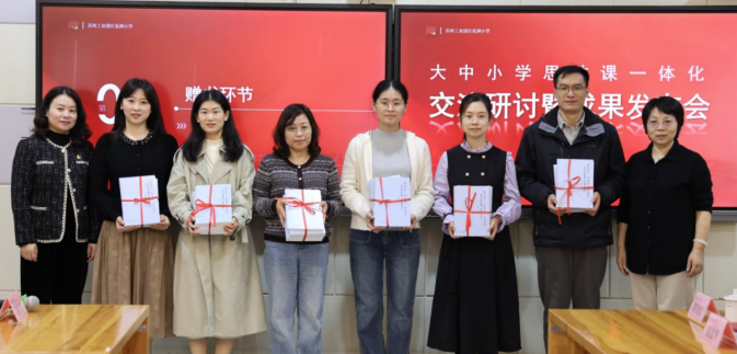 朱蓉蓉副院长分别与刘荣珍老师、王晓琳书记向各位中小学编委颁发参编证书,向各校教师代表赠送了《强引擎·全链条·专题式:大中小学思政课一体化教学设计》。在交流研讨环节,来自不同学段的教师代表们围绕集体备课、平台建设、大思政课建设等进行深入交流。大家一致认为,推进大中小学思政课一体化,是落实立德树人根本任务的战略举措,要进一步打破学段壁垒,开展常态化交流研讨,打造纵向衔接、横向贯通的协同育人格局。星洲小学党总支书记王晓琳在总结发言时指出,大中小学各学段要实现交流常态化”、研究“精准化”、成果“落地化”,共同推进大中小学思政课一体化走深走实