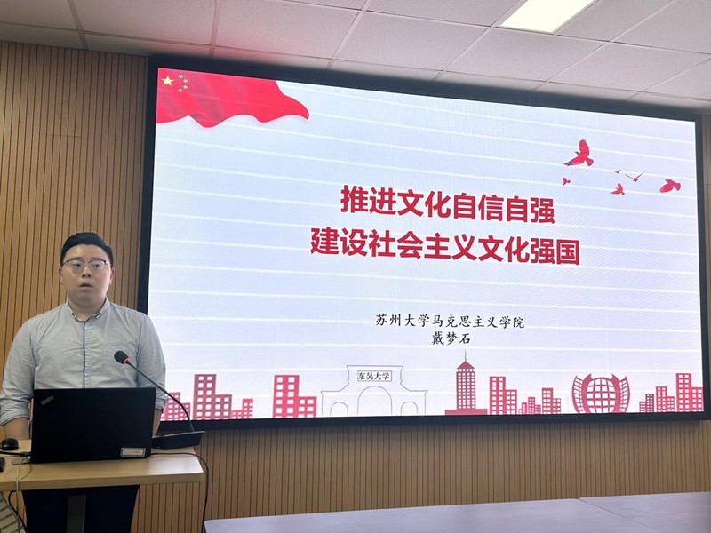 戴梦石老师以“推进文化自信自强 建设社会主义文化强国”为题,从“准确把握社会主义文化自信自强的深刻内涵、新时代文化建设取得辉煌成就与面临深刻变化、推进文化自信自强建设社会主义文化强国”三部分出发,结合党的二十大报告和实际案例,向学员们介绍了中国文化自信底气的构成——中华优秀传统文化、革命文化和社会主义先进文化。同时,戴梦石老师概括列举了新时代文化建设的主要成就,包括习近平文化思想的提出、社会主义核心价值观的弘扬、人民群众文化需求得到更好满足、国际上的中国形象更加鲜亮这四个方面,并从世情、国情和党情上指出新时代文化建设面临的变化。他号召各位学员在今后的学习生活中要从“建设具有强大凝聚力和引领力的社会主义意识形态、建设社会主义文化强国、提高全社会文明程度、繁荣发展文化产业和文化事业、增强中华文明的传播力和影响力”这五方面努力,为推进社会主义文化强国建设贡献力量。