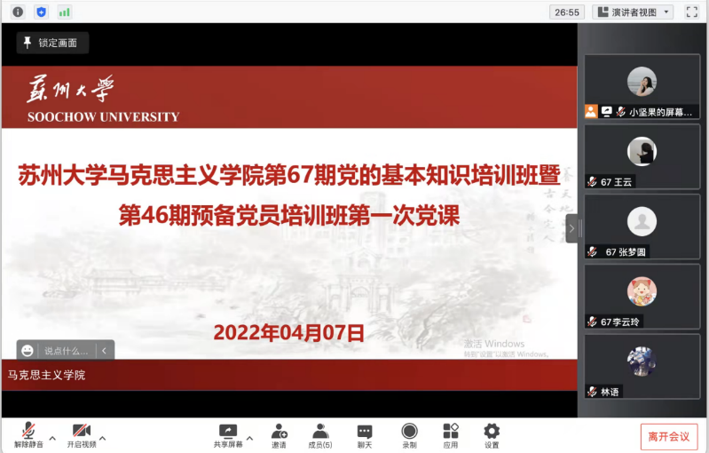 党委书记、分党校校长陈建军,学生党总支书记金鑫,研究生党员服务中心成员、第67期党的基本知识培训班以及第46期预备党员培训班全体学员参加了本次党课。本次党课由2021级硕士研究生刘晗晗主持。