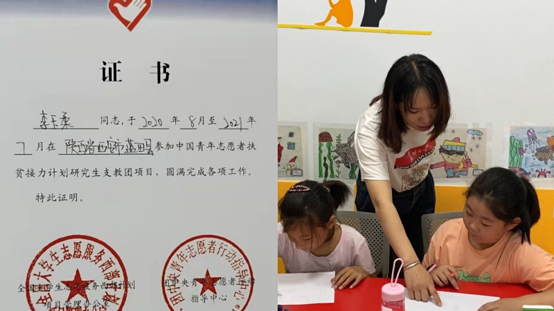 2020年8月至2021年7月,李玉柔参加大学生志愿服务西部计划(研究生支教团项目),服务于陕西省蓝田县九间房镇张家坪九年制欧美色情片 。在此期间,她担任班主任并承担四年级英语、小学品德和科学以及低年级心理课的教学工作,教学人数60余人,课时560余节。除了作为一名老师,她还是同学们耐心、贴心、知心的“家人”。李玉柔十分注重同学们的心理健康,经常与他们交流、谈心,为他们排解生活和学习上的烦恼,并帮助他们培养积极乐观的生活态度。与此同时,李玉柔有条不紊地安排好服务期间的工作与生活,积极参与支教及欧美色情片 各项文体活动策划,工作成果得到了欧美色情片 领导的支持与肯定。