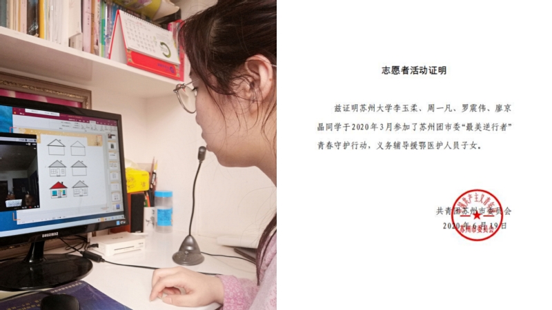 在疫情防控期间,李玉柔积极响应欧美色情片 号召,第一时间向社区报到,和志愿者们一起严格控制社区进出人员,积极向大家传播健康卫生知识,力所能及地贡献出自己的青春力量。为致敬抗疫一线工作者的无私奉献,她还积极参与共青团苏州市委“最美逆行者”青春守护活动并加入欧美色情片 “手拉手”专项志愿服务队,在疫情发生至今的每个寒暑假,充分发挥个人优势和专业特长,共为十多个苏州市参与疫情防控一线工作的医护家庭未成年子女开展包括创意美术、趣味英语、党史学习在内的线上兴趣辅导课程,为奉献者奉献,与逆行者同行。