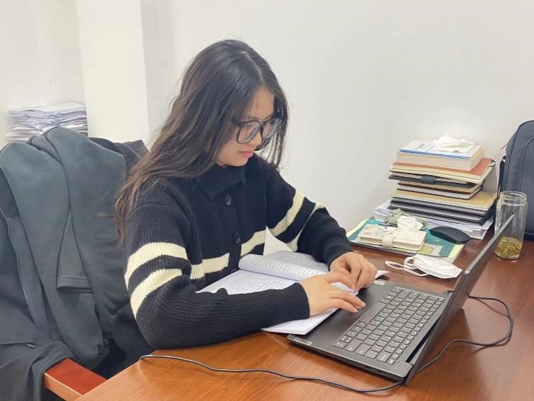 图为:刑梦姿在乡村农村办公室参加社会实践