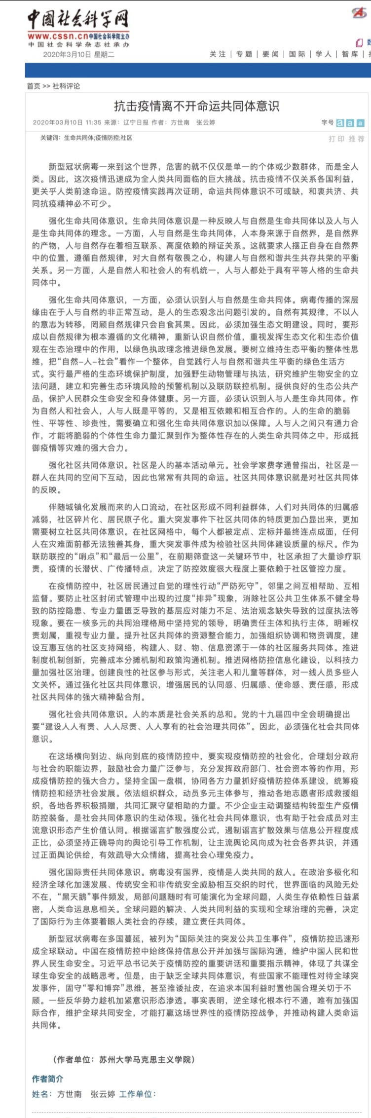 方世南 张云婷:抗击疫情离不开命运共同体意识