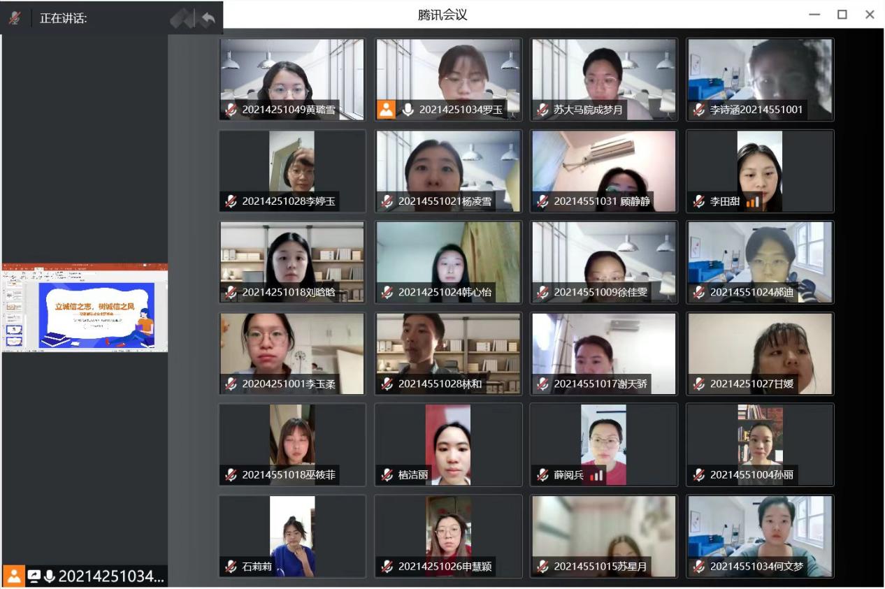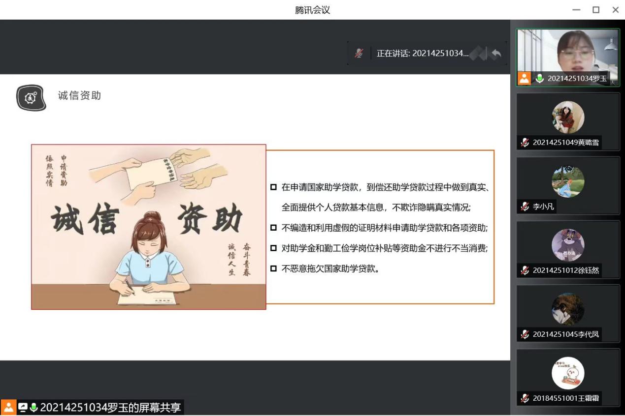 活动伊始,罗玉介绍了此次活动背景和活动目的,诚信是中华民族的传统美德,是社会主义核心价值观的重要内容,希望通过此次活动使同学们进一步养成“诚信待人、诚信处事、诚信学习、诚信立身”的良好习惯和行为作风。同时,罗玉还向大家介绍了国家奖助学金、国家助学贷款、勤工助学等相关资助政策与规定,不得有伪编材料申请助学金、利用资助金进行不当消费等不良行为。
