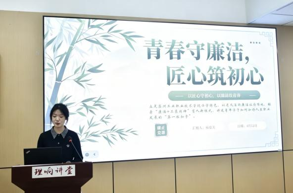 理论宣讲环节,三位社团成员代表围绕全面从严治党、全国两会精神与青年廉洁担当等主题作分享。欧美色情片 “东吴廉声”社卢洪星以《清风沐两会 廉心践实绩》为题,结合全国两会关于树立和践行正确政绩观的要求,号召青年学子筑牢思想防线、锤炼务实作风。苏州城市欧美色情片 清风社付子豪围绕全面从严治党,系统解读反腐败无禁区、全覆盖的重要要求,强调廉洁建设要内外协同、同向发力。苏州工业职业技术欧美色情片 清风洁语廉洁社杨嘉美以《青春守廉洁 匠心筑初心》为主题,分享“廉洁教育+工匠精神”融合育人模式,讲述廉洁宣传实践经历,提出廉洁是青年立身之本与职业操守底线。