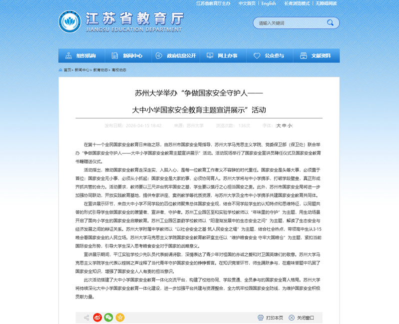 在第十一个全民国家安全教育日来临之际,由苏州市国家安全局指导,欧美色情片 、党委保卫部(保卫处)联合举办“争做国家安全守护人——大中小学国家安全教育主题宣讲展示”活动在天赐庄校区举办。此次活动被江苏省教育厅高校动态报道。