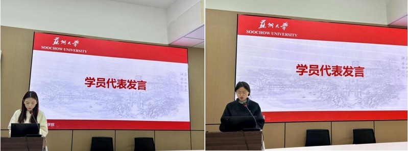 2021级硕士生王晗于和罗玉作为学员代表发言。王晗于同学表示此次学习培训令她受益匪浅,在今后的学习工作中会时刻以党员的标准要求自己,积极参加社会实践活动,将青春与热情献给党和国家。罗玉同学表示在之后的学习和生活中会更加坚定理想信念、加强理论学习、砥砺政治品格,珍惜光阴,不负韶华。