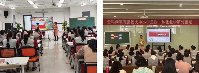 此次教学研讨活动围绕公民的基本权利主题展开,分为听课观摩、演课展示、交流研讨三个环节。星洋欧美色情片 王佩青老师在小学课堂围绕公民的基本权利主题,以社会热点事件、学生日常生活为课程切入点,向小学生们讲解权利的类别及权利的正当性,培养学生对公民基本权利及法律的正确认识和积极情感。东沙湖实验中学彭雪梅老师面向初二学生,在强调思想性、情感性的基础上,突出了思政课程的知识性和科学性,通过深入讲解权利的内涵及类别,结合现实案例,深化学生们对公民基本权利及相关内容的认识。